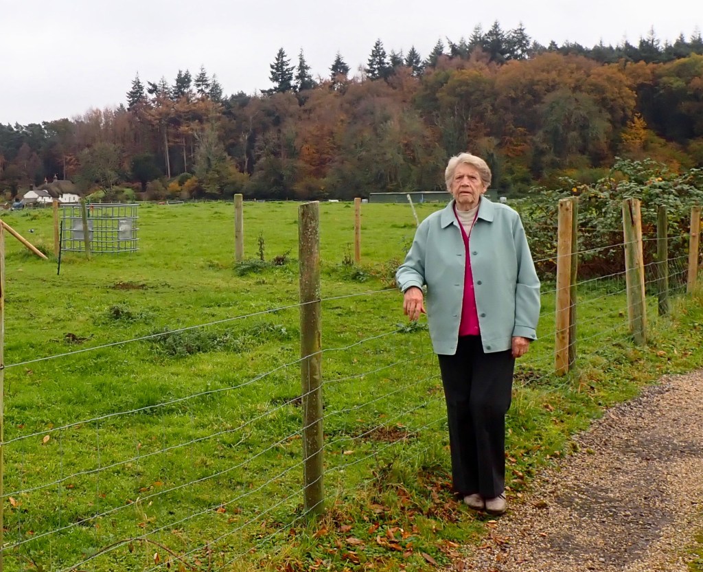 The photographs show Eileen Riglar in front of the wood where she planted conifers during her early years in Briantspuddle, and in her garden with some of the locally grown oak saplings to be planted in the gaps in the woodland now that many of those conifers have been removed.